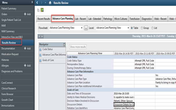 The Advance Care Planning/ Goals of Care Discussion Record allows for centralized, multidisciplinary documentation of all information pertaining to a patient’s goals or wishes. The centralization of goals of care documentation allows for rapid access to this vital information, reduces the risk that goals of care charting will be missed within discipline-specific notes, ensures that all members of the team are on the same page, and ensures that the patient’s wishes are respected whenever possible.