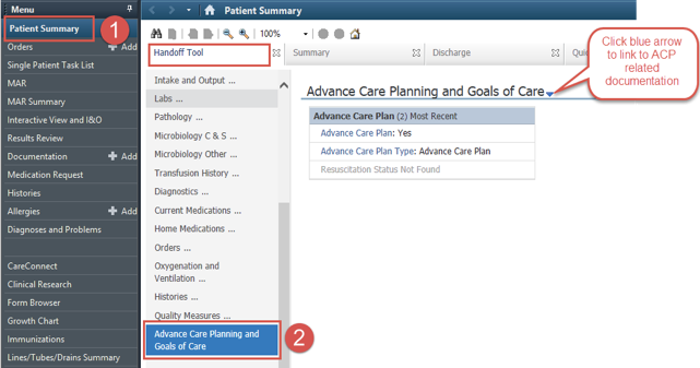 In order to avoid double-charting, clinicians can document a brief note in their own discipline’s progress notes directing readers to the documentation: “Please see the ACP/GOC Discussion Record for identification of the need for a goals of care conversation.”