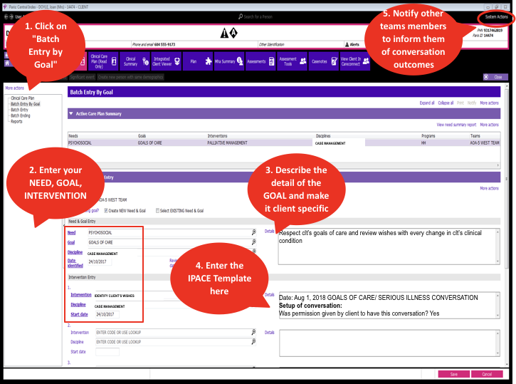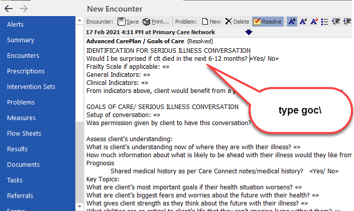 The clinician should make an entry in the ACP/GOC Discussion Record anytime the patient or Substitute Decision-Maker articulates their wishes, fears, concerns about their prognosis, uncertainty over treatment/decisions, etc… At times this may be a planned conversation that is initiated by the clinician, and in other circumstances, it may be spontaneous conversation that begins with a comment made by the patient or their decision-maker. Any follow-up actions should also be documented.